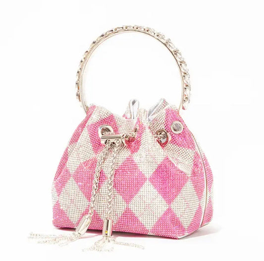 Checkered pattern crystal evening bag| black, and white Rhinestones purse